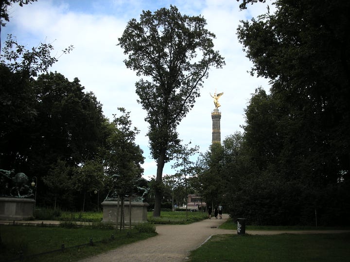 I’ve made a point to get outside to make up for the last few months of work that had me tied to my desk at home. I wander a lot during my first week here. Ostensibly I am searching for a spot in the sun to study Lokalpräpositionen and neue Wortschatz though I will never say no to a silent cemetery stroll or meadow-side meditation. My meandering throughout the week takes me to Goethepark, Volkspark Rehberge, Tiergarten, Mauerpark, and a wooded trail along the Panke. While on my strolls I see everything ranging from naturists lying out with a book to early-20s coming down from a night of clubbing.